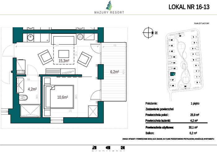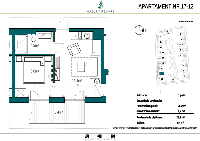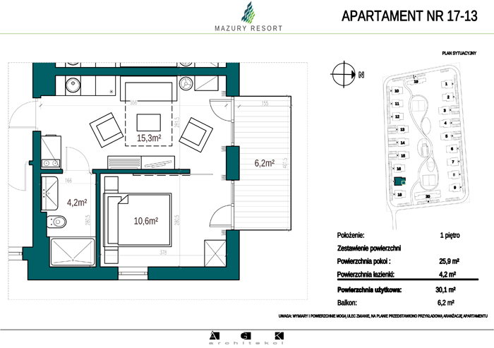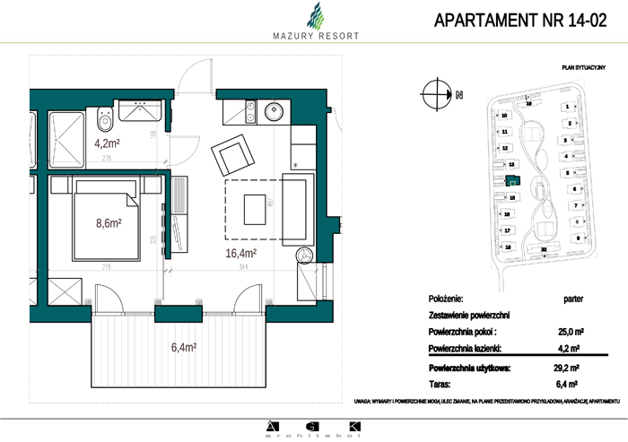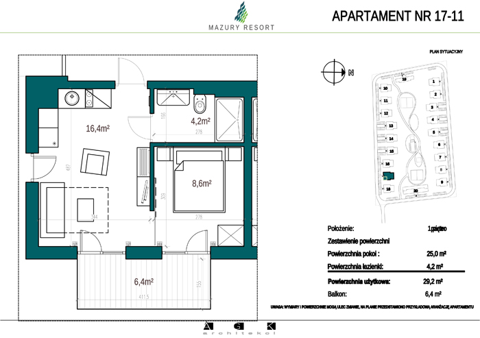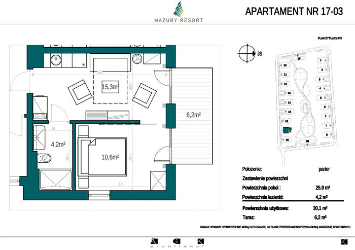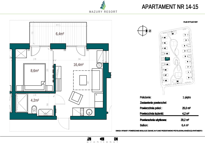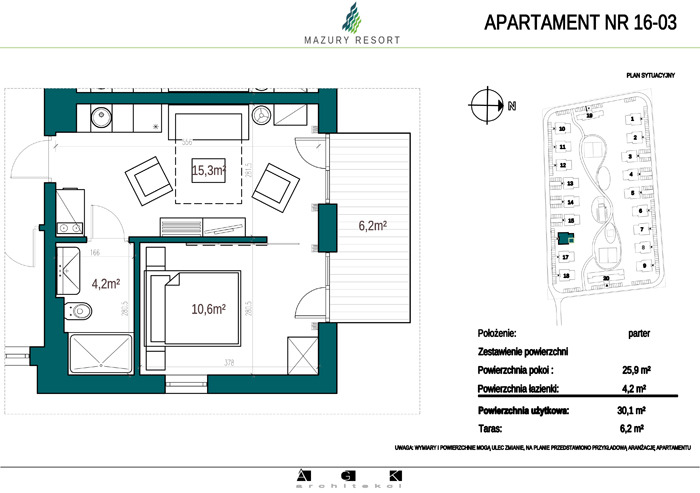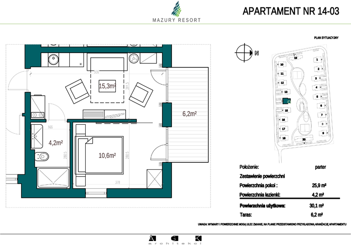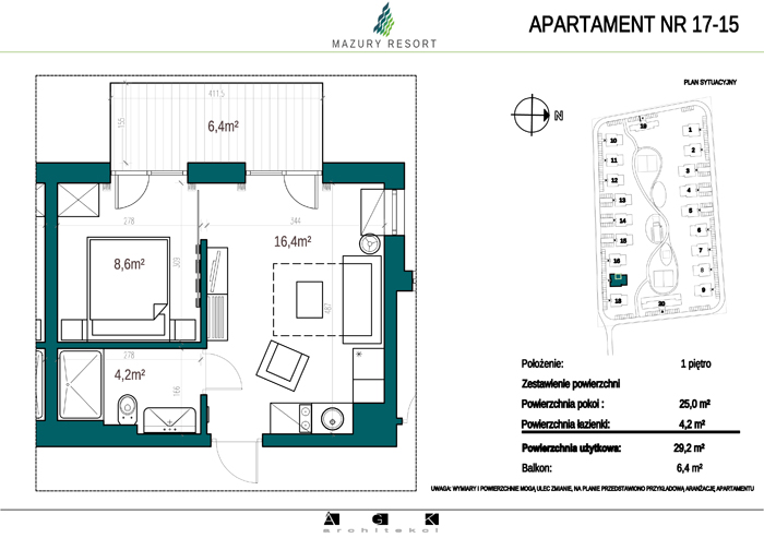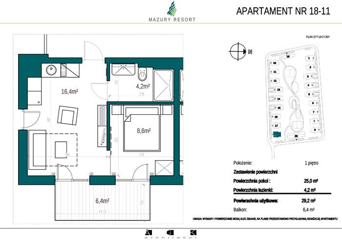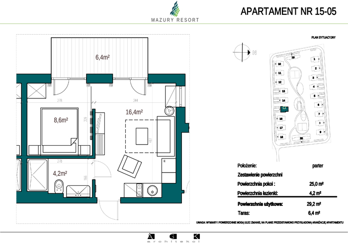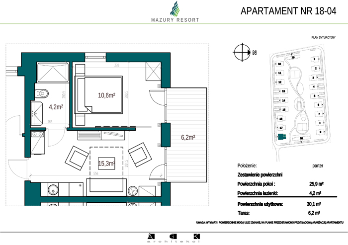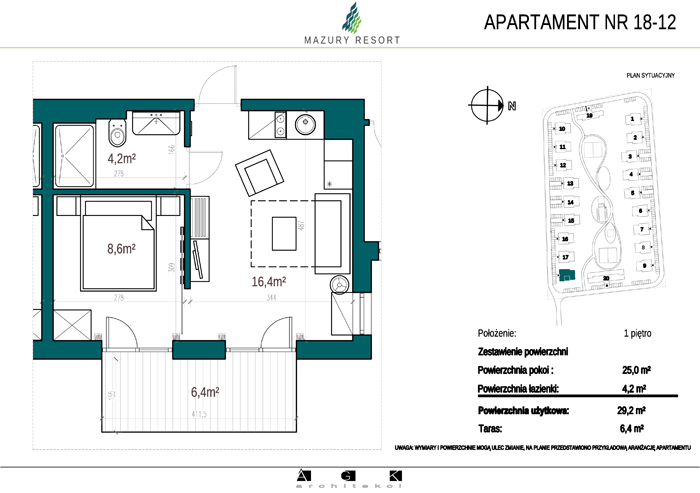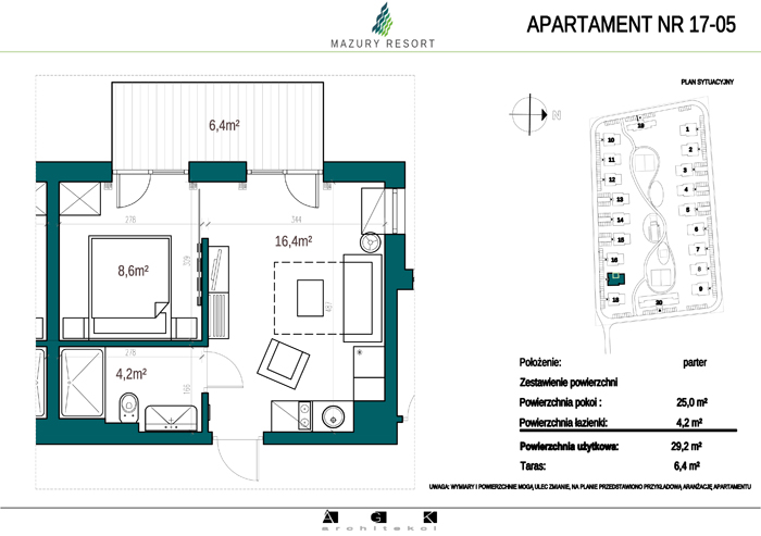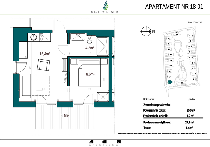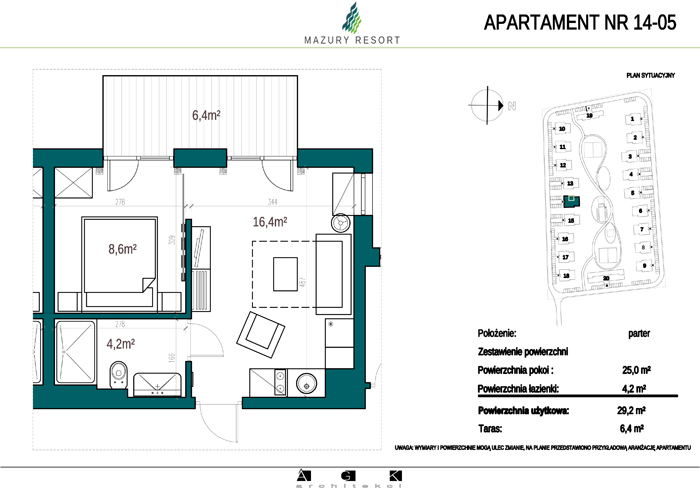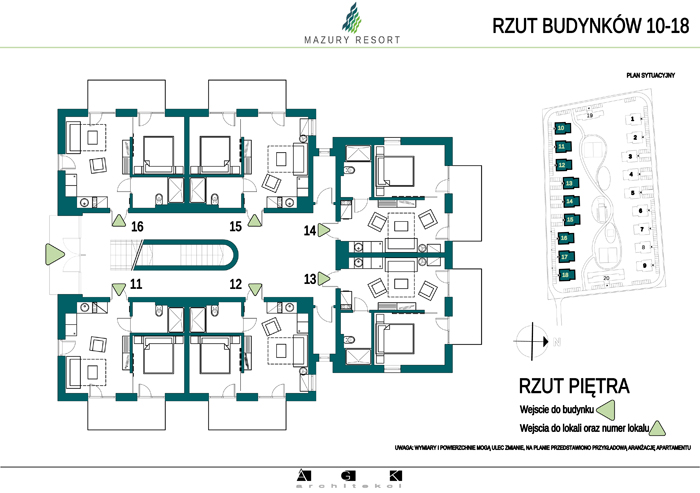 Wszystkie apartamenty w standardzie " pod klucz" zaprojektowane zostały w sielankowym, mazurskim stylu. Każdy apartament o powierzchni ok 30m2 składa się z pokoju dziennego z aneksem kuchennym, sypialni z obszerną szafą i wygodnej łazienki. W pokoju dziennym przewidziano rozkładaną sofę oraz funkcjonalny aneks kuchenny. Dla apartamentów na parterze wydzielono do wyłącznego użytkowania teren zielony przy budynku, apartamenty na piętrze posiadają własne balkony. W każdym budynku znajduje się 12 lokali: 6 na parterze i 6 na piętrze, w części ogólnodostępnej przewidziano miejsce na rowery. Każdy apartament posiada własne miejsce postojowe.